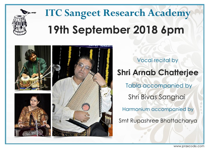 Forthcoming concert of Pt Arnab Chatterjee at ITC Sangeet Research Academy Kolkata on 19th September 2018 6pm onwards