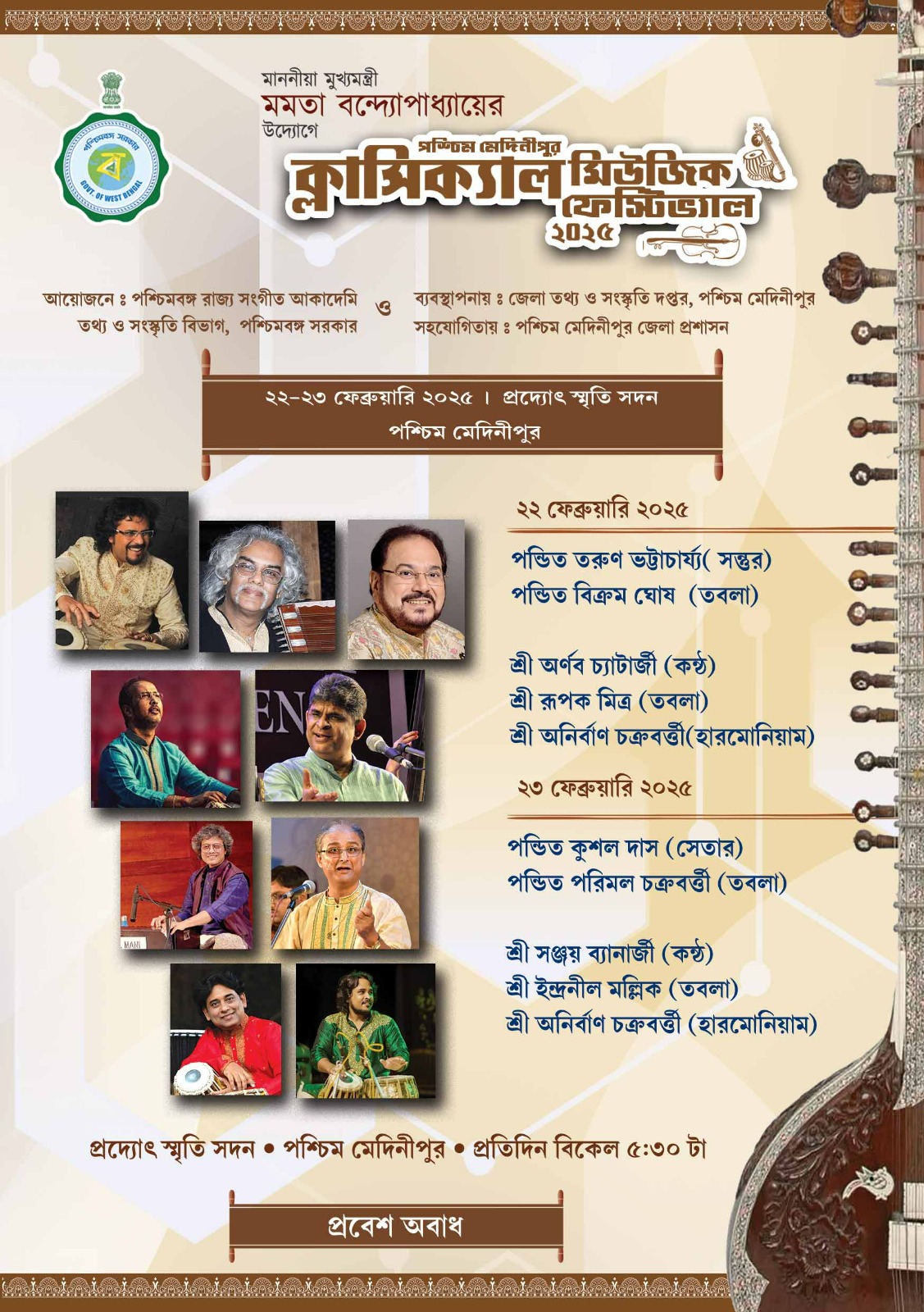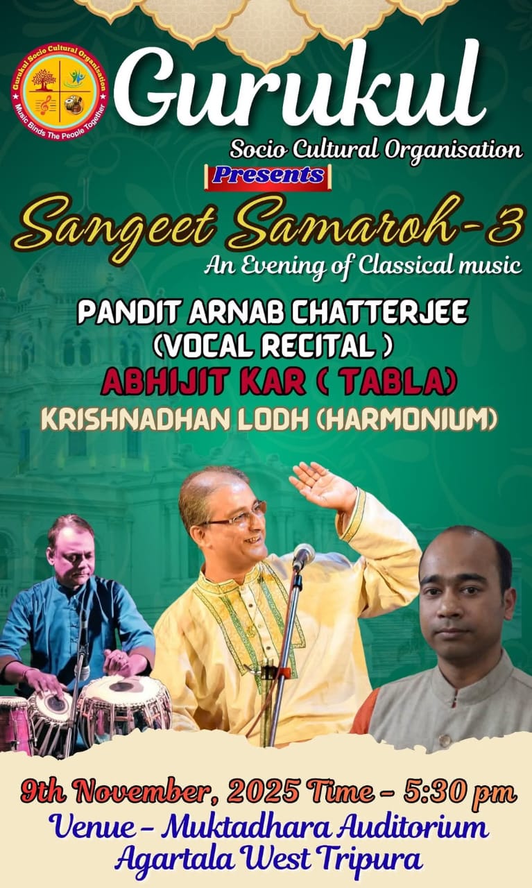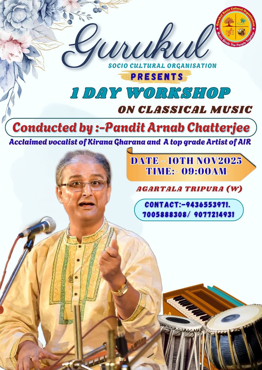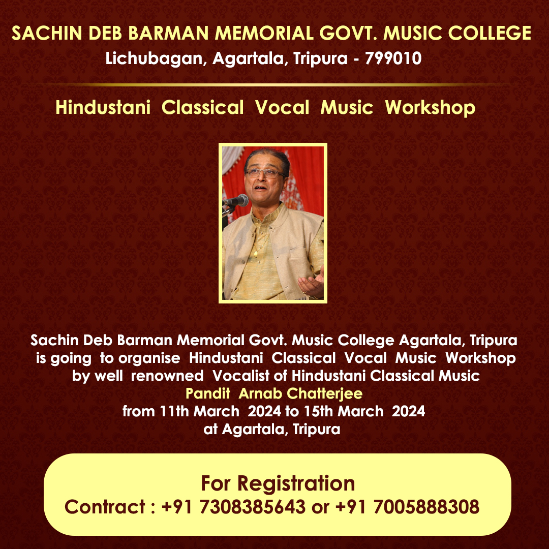 Sachin Deb Barman Memorial Govt Music College Agartala,Tripura is going to organise Hindustani Classical Vocal Music Workshop by well renowned Vocalist of Hindustani Classical Music Pt Arnab Chatterjee from 11th March 2024 to 15th March 2024 at Agartala, Tripura